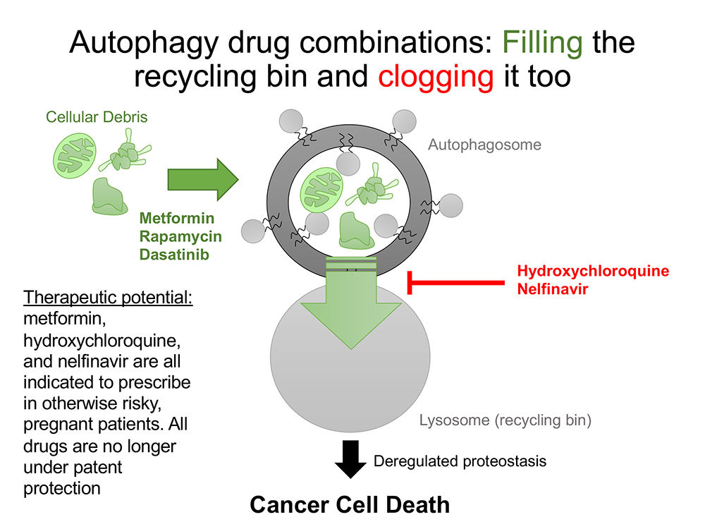 Autophagy is a cellular recycling process that occurs in all human cells, Delaney explained. Although the drugs in question – hydroxychloroquine, nelfinavir, metformin, dasatinib and sirolimus – were developed to treat, respectively, malaria, HIV, Type 2 diabetes and chronic myeloid leukemia and to prevent organ rejection in kidney transplant patients, what they all have in common is that they affect this cellular recycling process.